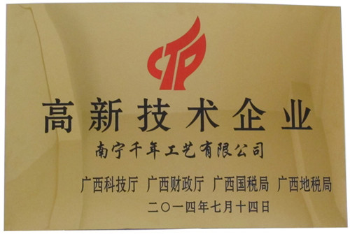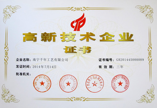 (本網(wǎng)訊) 熱烈慶祝集團(tuán)公司------千年工藝獲得了由廣西科技廳、廣西財(cái)政廳、廣西國(guó)稅局、廣西地稅局聯(lián)合頒發(fā)的“高新技術(shù)企業(yè)證書”,成為廣西2014年首批國(guó)家級(jí)高新技術(shù)企業(yè)之一。